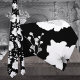 Ein schwarz-weißer Hochzeitshals mit einem soliden schwarzen Hintergrund mit weißen Blüten von Pfannenbäumen und Grünpflanzen.