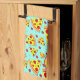 Das türkisblaue Handtuch ist mit einem roten und gelben Pizzaschnittmuster bedruckt. Unten rechts vom Handtuch befindet sich ein monogramm gelber Kreis, in dem Sie Ihre eigenen Initialen hinzufügen können