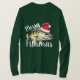 Eine Sitzbank trägt eine Weihnachtsmannmütze und der Text lautet "Fröhliche Fishmas" auf diesem lustigen "hässlichen Pullover".