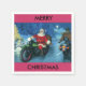 Père Noël sur une moto agitant et à cheval à travers un pays des merveilles hivernales