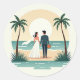Enthält 20 kleine Aufkleber auf einem Blatt. Feiern Sie Ihren romantischen Hochzeitsmoment am Strand mit diesem bezaubernden Aufkleber! Ein stilvolles Ehepaar in Hochzeitskleidung steht Hand in Hand und blickt auf den Sonnenuntergang am Ozean, flankiert von Palmen.