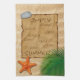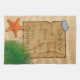 Altes Pergamentpapier mit Palmenblättern, Stein und Seestern auf Strand-Sand Hintergrund. Einfach Sommer: Sonnenuntergang, Küste, Sand, Muscheln, Meer, Schwimmen, Sonne, Surfen.