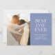Diese periwinkle Hochzeitsankündigung zeigt auf der rechten Seite die Worte "bester Tag aller Zeiten" mit Platz für ein Foto auf der links zusammen mit Platz für ein weiteres Foto auf der Rückseite. Benutzen Sie es als Hochzeitsankündigung oder als Ankündigung für die Entstehung.