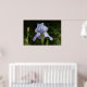 Hübsche Perwinkle-Iris mit weißer Mitte und gelbem Bart und Knötchen, die sich im Hintergrund öffnen lassen. Seide auf zarten Blättern. Grüne Sträucher sind in der Ferne verschwommen. Original Fotografie © TamiraZDesign.
