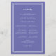 Das elegante, minimalistische, blau-weiße Hochzeitsfeier-Programm zeichnet sich durch ein schlichtes, modernes Design mit einer doppelten gerahmten Grenze in knalligem Weiß auf einem trendigen, periwinkelblauen Hintergrund aus. Traditionelle, klassische Formulierungen sorgen für zeitlose Eleganz. Personalisieren Sie Ihre Trauungsdetails für Ihre Gäste in trendiger Schrift & Schrift. Die Rückseite der Karte passt zu weißen Buchstaben auf einem knalligen blauen Hintergrund und dreht sich um Ihre Hochzeitsfeier. Für optimale Ergebnisse ersetzen Sie die Vorlagendetails durch Ihre eigenen Daten, die den Bereich zwischen den Absätzen wie im Beispiel verlasse. Capitalisieren und verwenden Sie alle Kleinbuchstaben, wo angegeben. Wenn Sie Fragen zu diesem oder einem unserer Produkte haben oder eine Farbanfrage haben, kontaktieren Sie mich bitte unter invitationsuites@gmail.com oder mit der Message-Funktion.