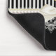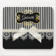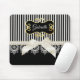 Ein Vintages viktorianisches Art mousepad, das die farbigen vertikalen Schwarzweiss-Streifen verschönert mit einem Bild eines cremefarbenen Bandes gebunden in einen süßen Bogen hinzugefügt zu einer Schnur der eleganten Perlen kennzeichnet. Personifizieren Sie diesen eleganten Entwurf, indem Sie Ihren Namen dem verziertes Gold umrandeten Rahmen hinzufügen. ANMERKUNG: Dieses ist ein Ebenedruckbild. Der Bogen, die Spitze, die Perlen und der Goldrahmen sind- NICHT wirklich.