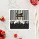 Vintage, Viktorianische Papierservietten mit schwarz-weiß gefärbten senkrechten Streifen, die mit einem cremefarbenen Band versehen sind, das an einer Kette von eleganten Perlen befestigt ist. Dieses elegante Design wird durch den Zusatz Ihres Namens zum verzierten goldfarbenen Rahmen individuell gestaltet. HINWEIS: Dies ist ein flaches, gedrucktes Bild. Der Bogen, Spitzen, Perlen und Goldrahmen sind NICHT real.