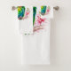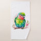 Serviette sertie d'une jolie illustration de perroquet. Un petit perroquet vert aux couleurs bleu et jaune se mélangeant. Le cou a une teinte vif de rose rougeâtre.