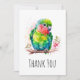Carte de remerciements avec une jolie illustration de perroquet. Un petit perroquet vert aux couleurs bleu et jaune se mélangeant. Le cou a une teinte vif de rose rougeâtre.
