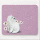 Niedliche, weiße Perserkatze und zarte Blume auf violett rosa Untergrund und weiße Button Punkte.