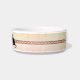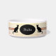 White Keramik Katzenfutter Schüssel hat zwei Katzengrafiken auf jeder Seite des schwarzen Namens Platzhalter. Auf jeder Seite des Namens gibt es ein knisterndes Farbband. Der Hintergrund hat einen ausgewaschenen Aussehungstuhl. Entworfen von HAMbyWhiteGlove.