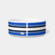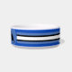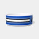 Weiße Keramik Katzenfutterschale mit vier Tonstreifen, Weiß und Schwarz als Grundlage, und jede koordinierende Farbe, die Sie bei der Option "Anpassen" wählen (innerhalb der personalize Option) erscheint in zwei Tönen .HAMbyWhiteGlove. Hier in Blau dargestellt.
