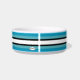 Weiße Keramik Katzenfutterschale mit vier Tonstreifen, Weiß und Schwarz als Grundlage, und jede koordinierende Farbe, die Sie bei der Option "Anpassen" wählen (innerhalb der personalize Option) erscheint in zwei Tönen .HAMbyWhiteGlove. Hier in einem aquamarinen.