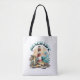 Personalisierte Strandtasche. Illustration einer Strandszene mit Leuchtturm, Surfbrettern, Palmen und Delphin.