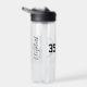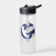 Diese Wasserflasche mit Volleyball-Thema mit dem Namen und der Jersey-Nummer des Athleten enthält das Wort "Volleyball" vertikal orientiert über das realistische Bild eines einfachen Volleyballs - die blauen Paneele des Volleyballs können auf jede Farbe angepasst werden - durch katz_d_zynes