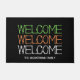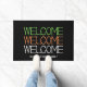 Einfache, personalisierte Halloween-WELCOME-Matte mit KUNDENBEWUSSTSEIN. Das Wort WELCOME wird in weißer, orangefarbener und grüner Skelettschrift wiederholt, mit einem reichen schwarzen Hintergrund.