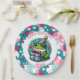 Niedliche personalisierte Geburtstagsfeier Teller für einen kleinen Geburtstag. Ein bezaubernder Frosch in einem Geburtstagshut, der ein Geschenk mit einem niedlichen Polka Dot Hintergrund in Rosa und aquamarin hält. Geben Sie den Namen in den personalisierenden Bereich ein.