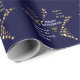 Stilvolles Blau und Gold personalisierte HAPPY HANUKKAH Packpapier, um Ihrer Familie und Freunden ein Happy Hanukkah wünschen. Das Design zeigt Text, der HAPPY HANUKKAH in weißer Typografie in der Mitte sagt, mit PEACE, LIEBE & JOY in goldfarbener Typografie in einer Ecke, und auch in HEBREW in der anderen Ecke geschrieben. Das ist Set vor einem Hintergrund goldfarbener Sterne vor Mitternachtsblau. Dieses Design ist auf dem ganzen Packpapier gefliest. Der Platzhalter-Text ist anpassbar, sodass Sie Ihren eigenen Gruß erstellen und Ihren Namen hinzufügen können. Ideal für die Verpackung Ihrer Chanukah Geschenke. Andere Kunsthandwerkskarten, Wohngestaltungen und Geschenke sind in der HANUKKAH Kollektion von Berean Designs erhältlich.