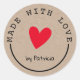 Stilvoll mit Liebe-Aufkleber für Ihre hausgemachten Geschenke mit niedlichem rotem Herzdruck auf Kraftpapier-Hintergrund. Personalisieren Sie mit Ihrem Namen.