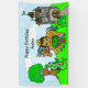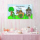 Kleiner Prinz mit Krone und Schwert, und sein Haustier, Drache und Frosch mit einer Burg und Baum mit einer Eule im Hintergrund, personalisierte Geburtstagsbanner. Ethnischer Prinz afroamerikanisch, hispanisch oder indisch.