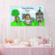 Kleiner Prinz mit Krone und Schwert, und sein Haustier, Drache und Frosch mit einer Burg und Baum mit einer Eule im Hintergrund, personalisierte Geburtstagsbanner. Ethnischer Prinz afroamerikanisch, hispanisch oder indisch.