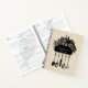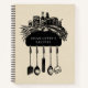 Retro personalisierte Lebensmittel und Utensilien Illustration Rezept Hardcover Notebook in schwarz und creme. Fügen Sie Ihren Namen hinzu und erstellen Sie Ihre neuen Rezepte mit Seiten-Sektionen für Rezeptur, Anzahl der Dienste, Vorzeit, Zutaten und Anweisungen.