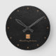 Luxuriöse mit Monogramm Rundwanduhr mit schwarzem Lederhintergrund und einem vergoldeten, metallisch gebürsteten Quadrat aus Kupfer mit elegantem Schriftzeichen-Namen und Monogramm-Initialen. ++++++++++++++ Einfach mit Ihren geschäftlichen oder persönlichen Initialen und Namen personalisieren. +++++++++++++ könnte ein personalisiertes Geschenk für Geschäftsreisende oder andere Gelegenheiten sein, die Dekoration im Arbeitsbereich oder im Büro.