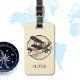 Personalisiertes, geräuscharmes Retro-Vintages Klassikflugzeug in Rot und Grün im Gepäck-Tag-Design mit kreisförmigem Hintergrund