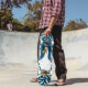 Fügen Sie einen Namen oder Ihren eigenen benutzerdefinierten Text hinzu, um ein personalisiertes Skateboard zu erstellen. Dieses Skateboard zeigt eine realistische Abbildung einer weißen Ente mit orangefarbenem Schein und Füßen vor einem marineblau mit weißen Federn.