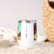Personalisierte Wasserflasche. Einzigartige Ai-Kunst, die eine schöne moderne Frau mit farbenfrohen Haaren und Sonnenbrillen in einem Bikini am Strand darstellt, in dem sie reflektiert wird. Pop Art Comic Stil gebrochen Kunst.
