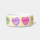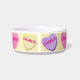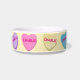 Dieser Valentinstag zeigt Ihrem Hund oder Ihrer Katze, wie viel Sie sie den ganzen Monat oder das ganze Jahr über Liebe haben. Nostalgische Süßwarenherzen in Pastellrosa, Grün, lila, Gelb und Blau umkreisen diese Schüssel und jedes Herz ist mit dem Namen Ihres Haustieres abgestimmt. Ein sehr niedliches personalisiertes Design für Ihr Haustier. Hellgelber Hintergrund.