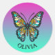 Personalisierter Aufkleber mit einem hübschen bunten Schmetterling in lila, aquamarin, blau und gelb.