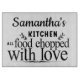 Vorgestellt ist ein eindeutiger Text mit folgendem Wortlaut: "Samantha's (personalisieren Sie diesen Namen) Küche - Alles Essen mit Liebe zerstückelt.