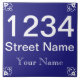 Machen Sie Ihre eigene Hausnummer. Addieren Sie Ihre Straße und Namen oder Handelsnamen. Spanische Fliesenart. Weiß auf Blau.