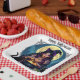 Eine hübsche Hexe, eine schwarze Katze, ein Frosch und ein Kessel Halloween-Party Papier Teller in schwarz, lila und orange.