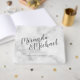 Personalisiertes, elegantes Gästebuch aus weißem Marmor mit personalisiertem Brautnamen und Bräutigam in grauem, modernem Drehbuch mit dem Titel und dem Hochzeitstag in grauem, modernem Sans Serif Schriftart auf weißem Marmorboden.