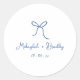 Blauer und weißer weißer, handgezeichneter Bow-Hochzeitskleber. Personalisieren Sie mit Ihren Namen und Hochzeitsdatum in blauem handgeschriebenem Schriftart.