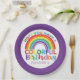 Farbige Birthday Rainbow Personalisierten Kids Girly Paper Teller. Ein unterhaltsamer Regenbogen aus Rot, Orange, Gelb, Grün, Blau und lila in der Mitte dieser lustigen Papierplatte. Text in mehrfarbigen liest HOFFEN SIE HABEN EINEN FARBHAFTEN BIRTHTAG. Personalisieren Sie sich mit dem Geburtsnamen des Kindes in heller lila. Bild in weißem Kreis mit dunklem lila Hintergrund. Anpassen, um den dunklen lila Hintergrund zu ändern. Rainbow-Party-Zubehör