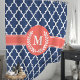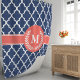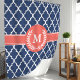 Entspannen Sie im eleganten marineblau-korallenblauen Duschvorhang mit marokkanisch inspiriertem Quarrefolienmuster in Ihrem Badezimmer. Das aufwändige Design und die individuell anpassbare Erstausstattung schaffen einen einzigartigen und stilvollen Akzent für jedes Badezimmer.
