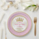 Super Hübschen Personalisierte Rosa und Gold Princess Paper Teller. Wählen Sie diese 12 Zoll Teller oder die 12 Zoll großen Prinzessinnen-Teller. Geben Sie den Text des Themed Party Princess in die Vorlagen des 2-Textfelds ein oder löschen Sie ihn. Golden tiara auf einem schönen weißen Satin-Look Kreis in der Mitte der Teller der Prinzessin zusammen mit 2 Textfeldern mit Ihrem Prinzessin themed Party und Namen und/oder Daten oder löschen Sie einen oder alle der temporären Text.