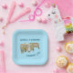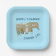 Camping-Papier-Teller mit RV-Bild 5. RV-Bild und benutzerdefinierter Text für Namen und "Camping-Lebensdauer". Individuell gestalten, mit quadratischen oder runden Plattenformen. Hellblaue Farbe mit dunkelblauem Text. Das Design ist ein RV mit Klappstuhl und Vorlagen oben und unten gebogen.