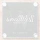 Fügen Sie Ihrer Hochzeit eine persönliche Touch mit personalisierten Trauzeugen Glas Untersetzer. Dieser Untersetzer weist den Namen des personalisierten Trauzeugen im Schriftart-Stil auf, mit Hochzeitsdetails im klassischen, weißen Serif-Schriftart-Stil und Monogramm im Schriftart-Stil in Grau-Serif als Hintergrund, auf schwarzem Hintergrund. Auch perfekt für Trauzeuge, Brautvater, Ringträger und mehr.