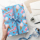 Diese himmelblaue personalisierte Eis-Geschenkpackung mit wasserfarbenen Erdbeeren und Erdbeereiskernen auf himmelblauem Hintergrund. Ich malte die Eis- und Erdbeerkonen von Hand auf Papier, mit Pinseln, die altmodische Art. Ihre Personalisierung erfolgt in Skripttypografie in einem koordinierenden Erdbeerbanner. Die Farben Rot, Rosa und Creme machen dieses Muster perfekt für jeden Anlass, von Geburtstagen und Feiertagen bis hin zu alltäglichen Geschenken.