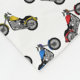 Modernes und trendy Name-Cartoon-Motorradmuster mit bunten Fahrrädern in Rotem, in Grünem, in Blauem und in Gelbem mit weißem Hintergrund und mit einem schwarzen grauen Streifen, der fügen personalisiert ist gerade, Ihre Namensgeschenke oder Monogrammgeschenke oder Ihre Initialen für ein einzigartiges Geschenk hinzu. Die besten Motorradgeschenkideen für Männer und Jungen und Mädchen.