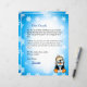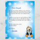 Fügen Sie dem personalisierten Brief des Weihnachtsmannes den Namen Ihres Kindes hinzu. Niedlicher Pinguin im Winter Hut mit Schneeball, Schneeflocken, blauem Hintergrund und Nordpol Schild.