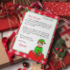 Fügen Sie dem personalisierten Brief des Weihnachtsmannes den Namen Ihres Kindes hinzu. Niedlicher Elf sitzt auf einer Tüte Spielzeug. Farbseite auf der Rückseite.