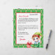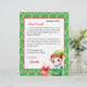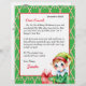 Fügen Sie dem personalisierten Brief des Weihnachtsmannes den Namen Ihres Kindes hinzu. Niedliche Elf mit einem Geschenk und einem Bonbonuntergrund. Auf der Rückseite befindet sich eine Farbseite des Weihnachtsmanns, die einen Keks mit Schneeflocken im Hintergrund hält.