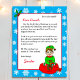 Fügen Sie dem personalisierten Brief des Weihnachtsmannes den Namen Ihres Kindes hinzu. Niedlicher Elf sitzt auf einer Tüte Spielzeug. Farbseite auf der Rückseite.