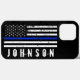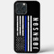 Dieses einzigartige Handy-Gehäuse verfügt über eine dünne blaue Polizei-Fahne in der Mitte in einem robusten und bedrückten Stil. Auf der Seite dieser Seite befindet sich ein Platz für den einzigartigen Vor- oder Nachnamen Ihres Geschenkempfängers.