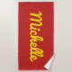 Personalisierter Name im gelben Skript auf Rot Strandtuch